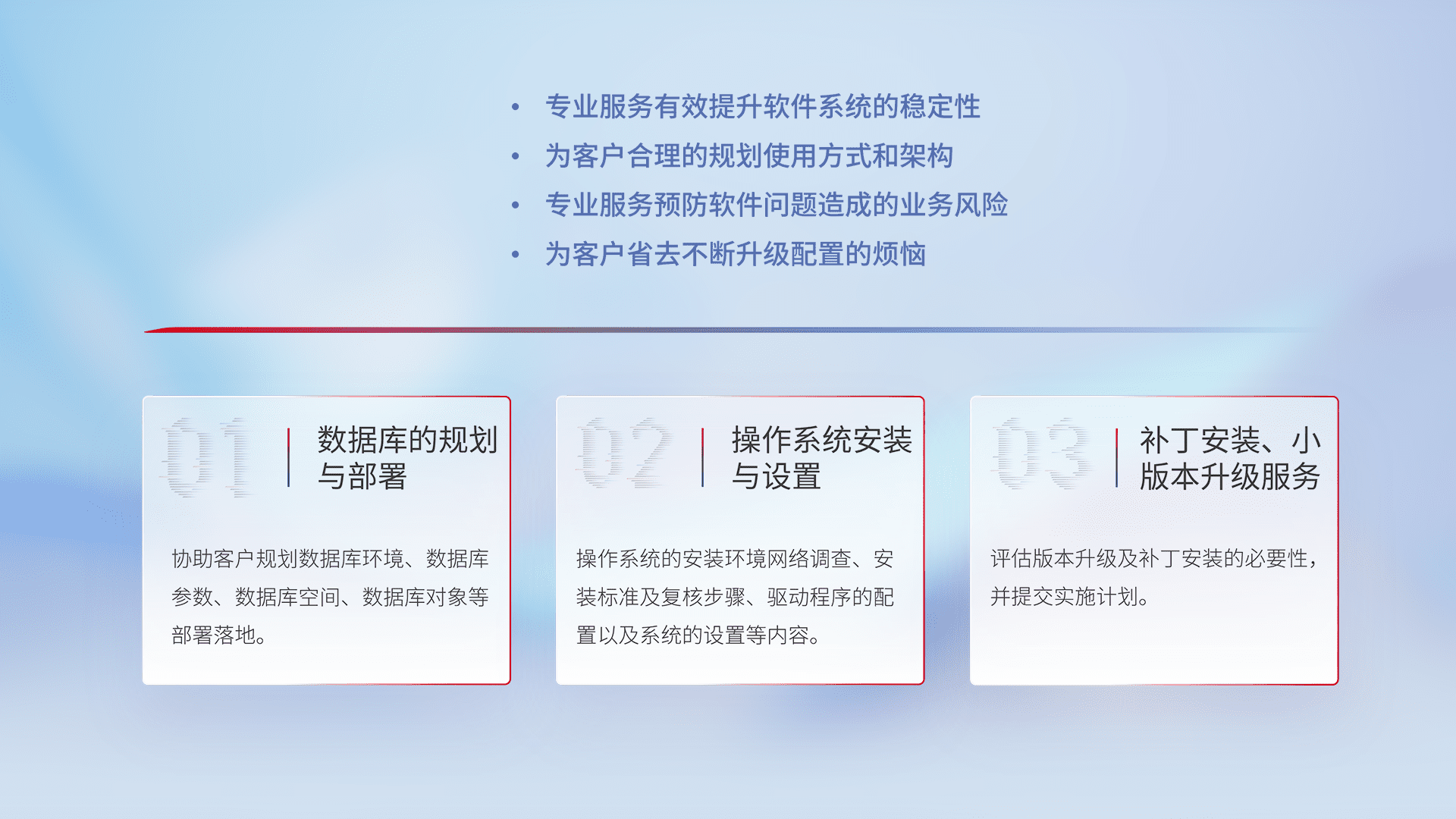 为客户提供软件规模升级、、快速部署、、按需配置的专业服务,,,,从数据库的规划与部署到操作系统的安装与设置,,再到补丁安装和小版本升级提供支持。。。。
